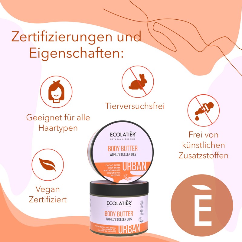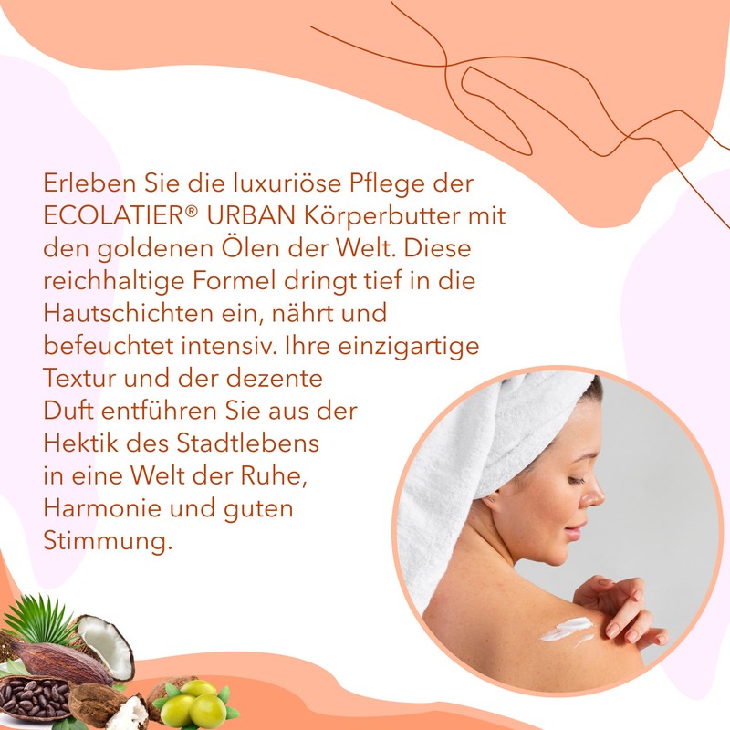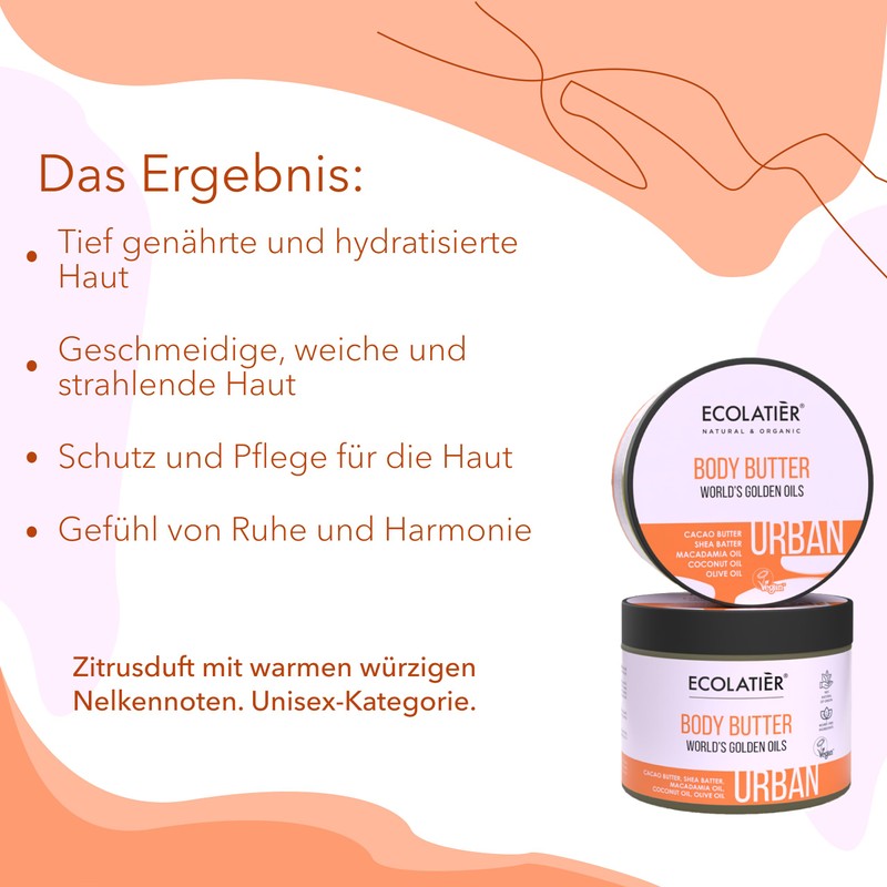 - Deeply effective body care: Ecolatier Urban body butter with golden oils provides luxurious care. Enriched with shea butter unrefined organic, it intensively provides the skin with moisture and nutrients, ideal for dry skin.