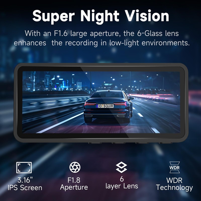 - Super Night Vision and WDR Technology: Ecomoment Dash Cam' adopts an ultra-large F1.8 aperture and 6 layers lens that increases 60% light intake, and is equipped with WDR (Wide Dynamic Range) technology, achieving super night vision by automatically balancing the exposure in extremely dark scenarios, to ensure clear and sharp footage.