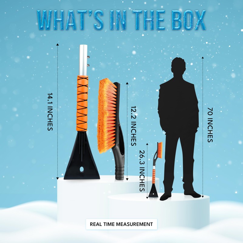 - Versatile & Compact Size: Measuring 27 inches, our snow remover for cars is perfect for reaching all areas of your windshield. The 9.5-inch brush and 4.3-inch scraper ensure you have the right tools for effective snow removal. Available in vibrant colors—Red, Orange, Blue and Green—this car snow shovel is designed for all vehicle types, including SUVs.