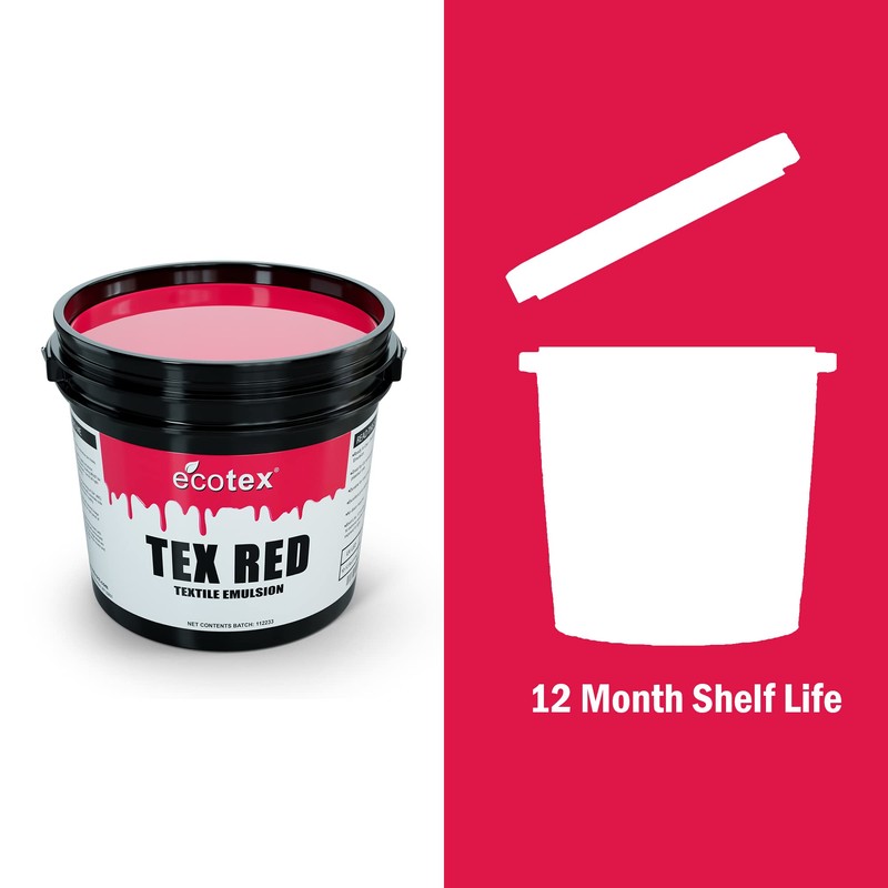 Ecotex TEX-RED is a killer Textile Pure Photopolymer Emulsion. It is pre-sensitized and ready for use. Works with Plastisol ink systems. Apply to clean, degreased, dried screen with a scoop coater. Be sure to use appropriate application techniques. Reclaiming Ecotex TEX-RED is easy with Ecotex Emulsion Remover.
