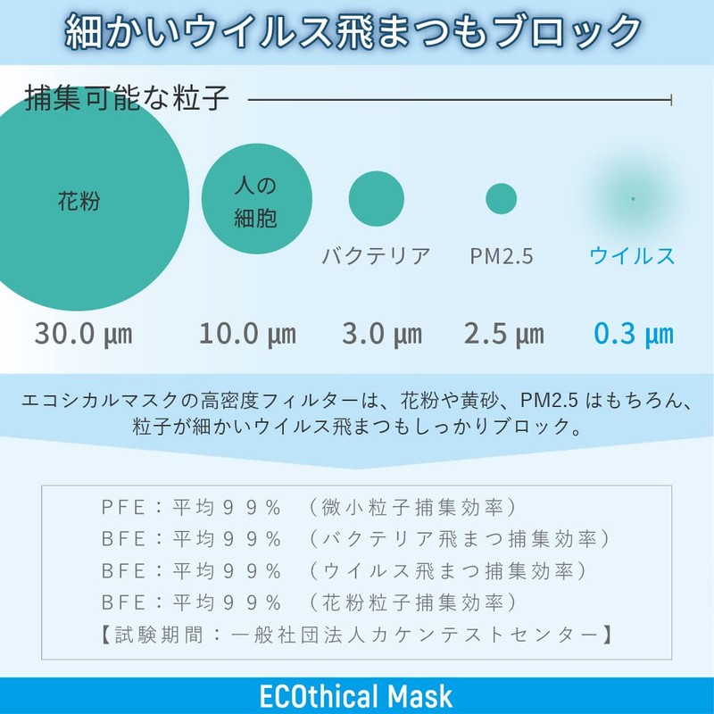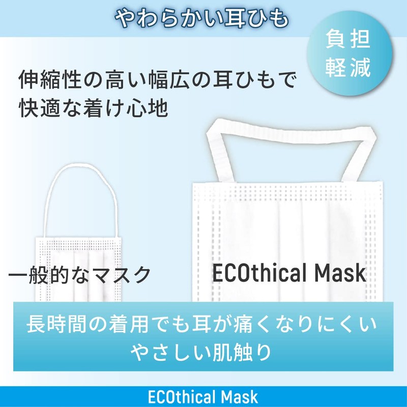 - 【やわらかい耳紐で負担を軽減】ECOthical Maskの耳紐は、肌触りがよく、ふんわりとやわらかい素材で耳への負担を軽減し、長時間着用していても耳が痛くなりません。伸縮性が高く、程よいキックバックの太く柔らかい耳紐を採用。耳が痛くなりにくいだけでなく、繰り返しの着脱時も耳紐が切れにくく、高い耐久性を保つため、伸びきってしまったり緩くなる心配がありません。