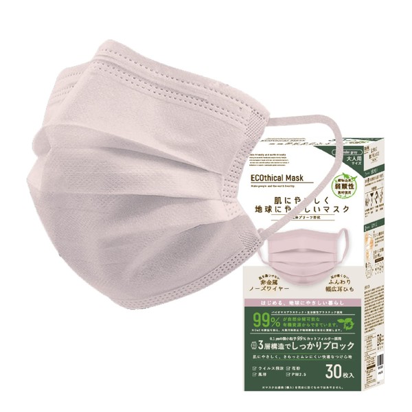 [ECOthical Mask] マスク 不織布マスク ふつうサイズ 30枚入り プリーツマスク 使い捨てマスク 不織布 肌にやさしい 耳が痛くなりにくい プリーツ型 ラベンダーグレー エコシカルマスク