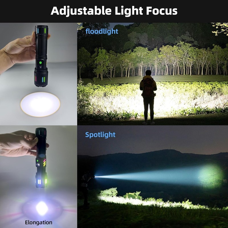 - 【Flashlights High Lumens】The super bright flashlight is equipped with an upgraded longbeam LED chip, with a brightness of up to 1000 lumens, 500% brighter than car lights. Our bright flashlight rechargeable can illuminate the darkness with ease, providing you with the brightness and clarity you need to see clearly. Suitable rechargeable flashlights for emergencies, home, outdoor camping, hiking.we can stretch the head to change the focal length and beam size, it has more powerful long range in spotlight and a wider field in floodlight.
