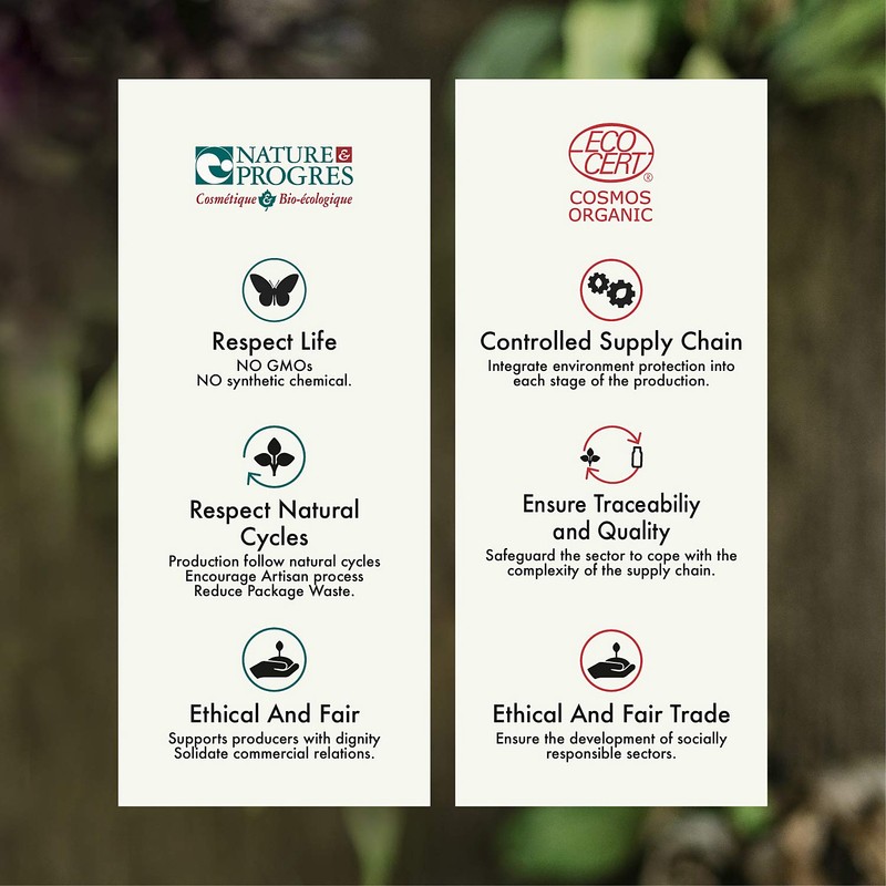 - Certified organic by: Ecocert Cosmos Organic & Nature et Progres