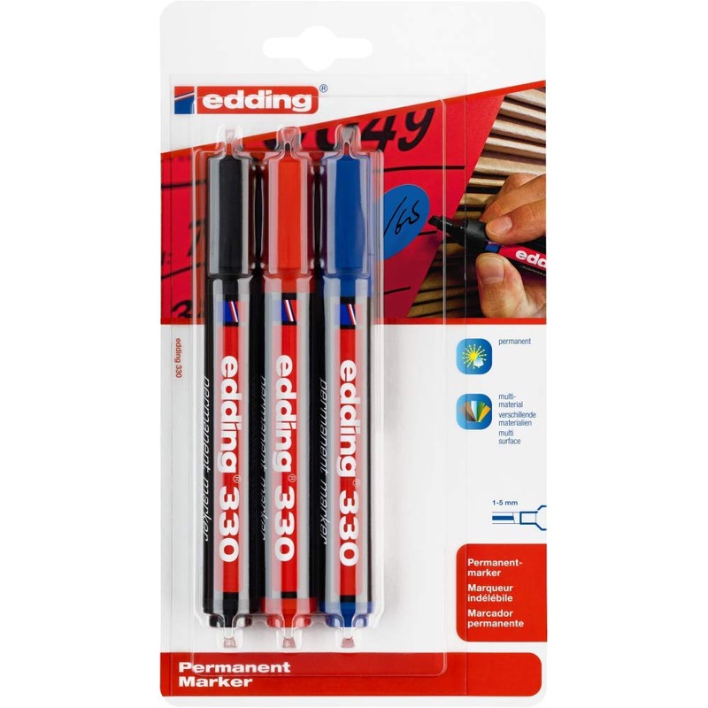 edding 330 permanent marker - black, red, blue - 3 pens - chisel nib 1-5 mm - waterproof, quick-drying, smear-proof pens - for cardboard, plastic, glass, wood, metal and fabric