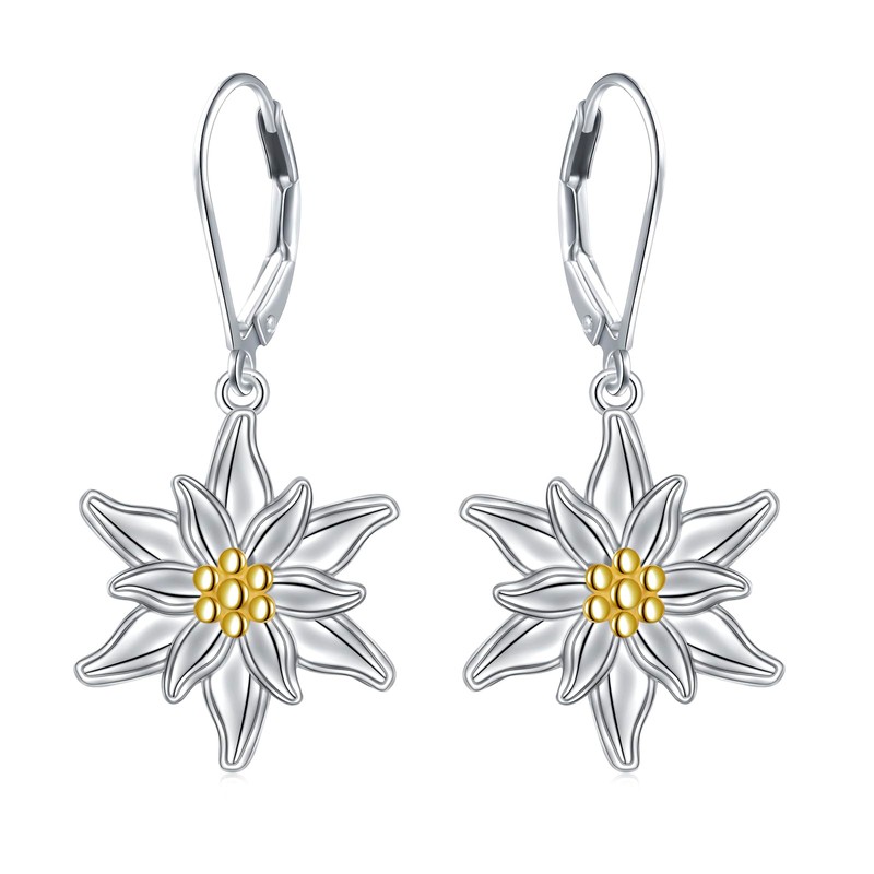 Edelweiss Earrings for Women Sterling Silver Edelweiss Flower Leverback Earrings Floral Earrings Dangle Drop Oktoberfest Jewelry Christmas Gifts, Sterling Silver, No Gemstone