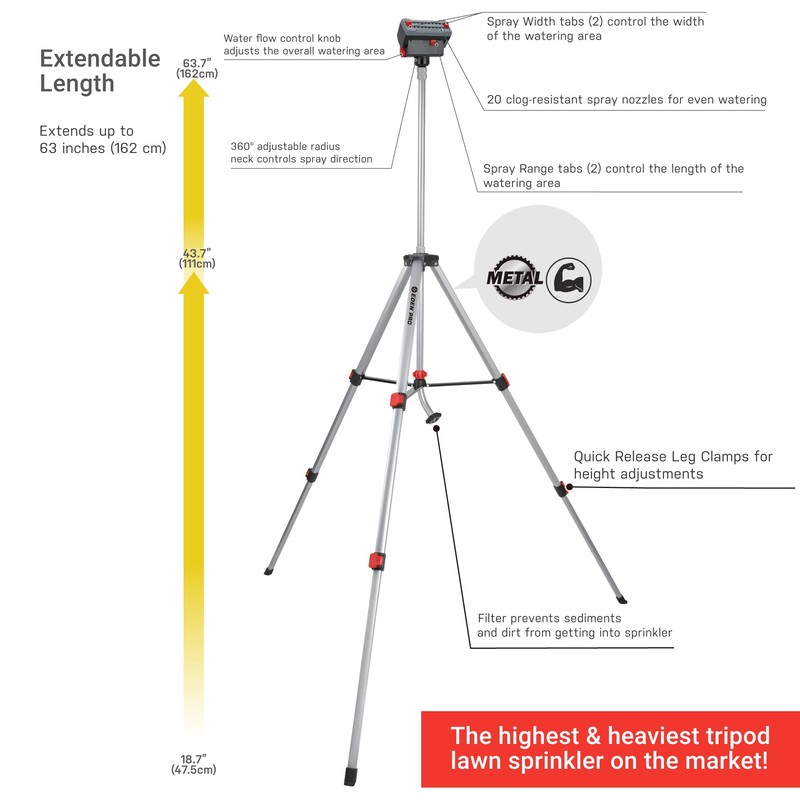• Heavy-duty metal tripod extends from 19”- 63” with quick-release leg clamps to water over taller plants and bushes