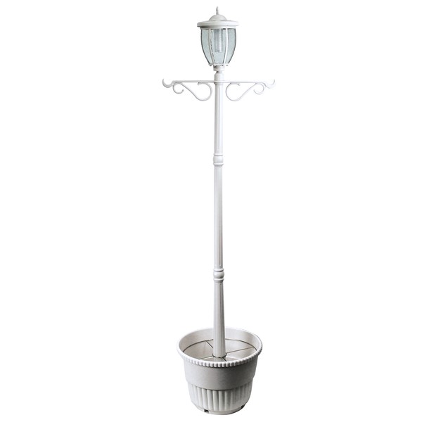 Illuminate the way with this solar lamp post and planter. This lamp post brings multifunctional style to your outdoor decor. This lamp post is constructed of a die-cast magnesium/aluminum alloy and plastic and finished in a durable white powder coated finish. Featuring a single solar powered headlamp with 6 bright white leds, that automatically turn on at dusk, and off at dawn. Features a 3-way switch for (off-amber-white) lit options. Plant your favorite flowers in the bottom planter, while the middle bar enables you to hang two hanging plants.