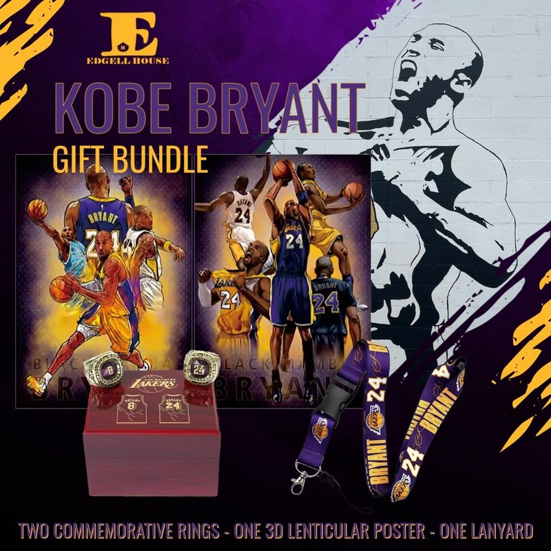 Edgell House Inspired by Kobe Bryant Collectibles Gift Set - Two Championship Rings and Display Case – One 3D Kobe Bryant Legends Poster – One Key Lanyard – All of it Black Mamba Themed