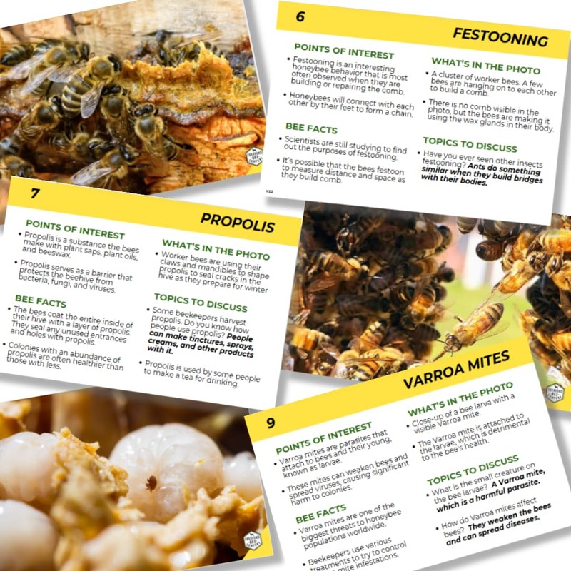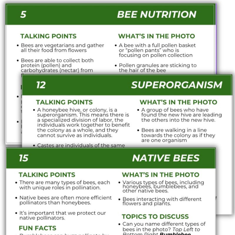 - BASIC PACK: The 15 cards cover a variety of topics, including foraging, bee stingers, find the queen, communication, swarming, and worker bee jobs.