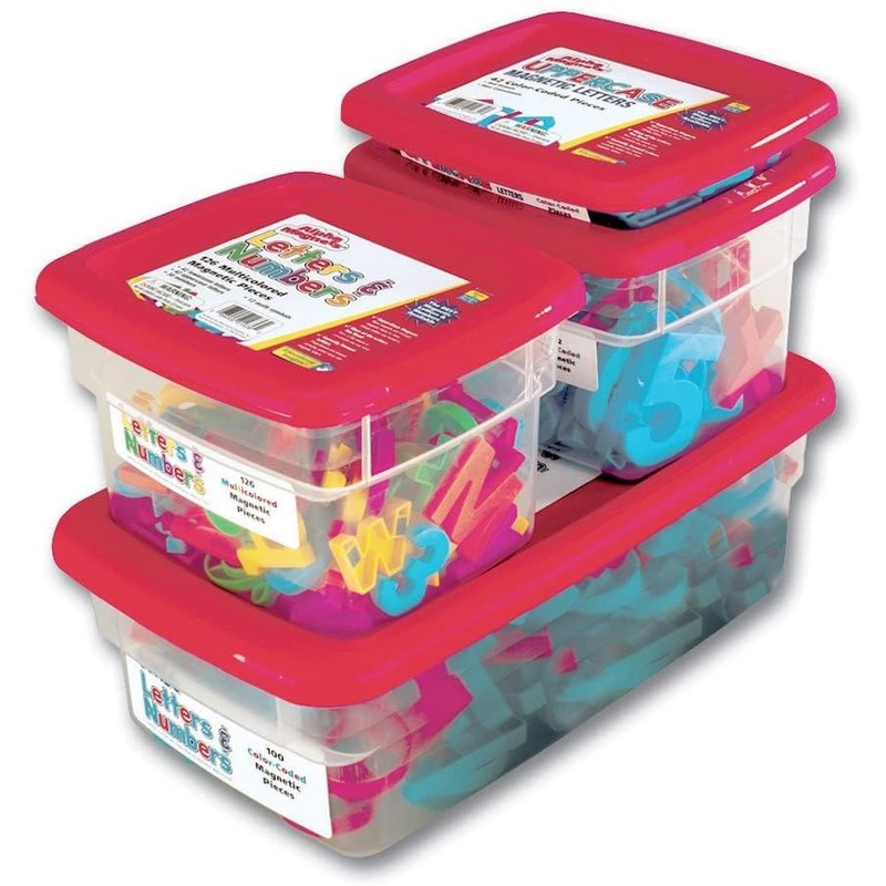 AlphaMagnets are shaped accurately with correct proportions, and are made with strong magnets for a "sure stick." Alphabet assortments come with more of the letters you need most (extra vowels a, e, i, o, u, and consonants b, l, m, r, s, and t), and include punctuation marks. Features 42 red, blue, green, yellow, orange, and magenta pieces, each 1.5" tall. Comes in a durable, stackable tub with brightly colored plastic lid for convenient self-storage.
