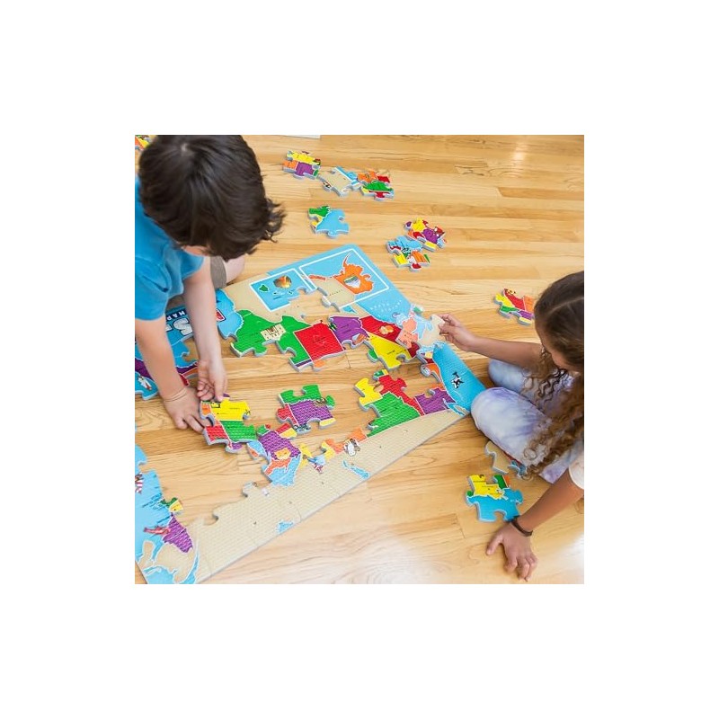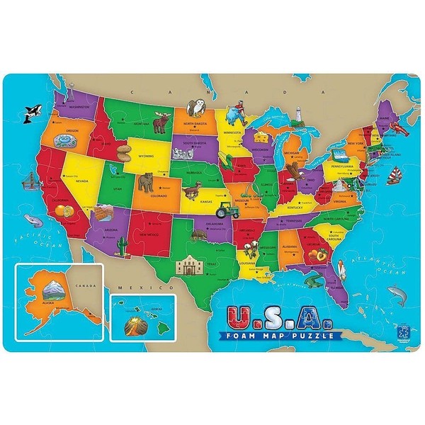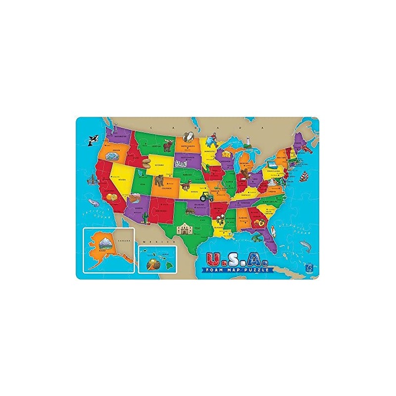 Travel cross-country through this beautiful, giant 2' X 3' Puzzle of the United States. Children can explore America's States, capitals, landmarks, animals, and more with hands-on play as they connect the pieces of this colorful, illustrated map. Includes 54 interlocking, water-resistant, and easy-to-clean puzzle pieces.