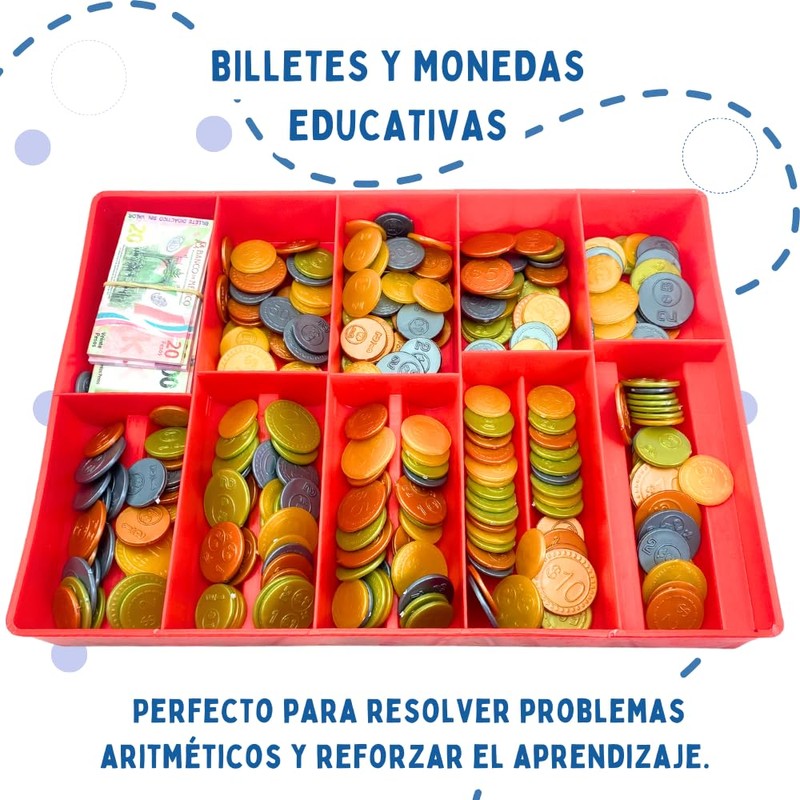 Características del Producto: Estuche de plástico resistente de 30 cm x 22 cm x 3.5 cm para fácil almacenamiento. Incluye 257 monedas de plástico en denominaciones de 50 centavos, $1, $2, $5 y $10, 150 billetes didácticos: 10 de $1000, 10 de $500, 20 de $200, 30 de $100, 40 de $50 y 40 de $20. Material didáctico para nivel preescolar y primaria. Aprendizaje Divertido y Realista: Perfecto para que los niños se familiaricen con el valor del dinero de manera práctica e interactiva. Ideal para Educación Matemática: Útil para resolver problemas aritméticos y desarrollar habilidades financieras. Beneficios: Ayuda a contar, sumar y restar con dinero, fomenta el pensamiento lógico y mejora la comprensión del valor monetario.