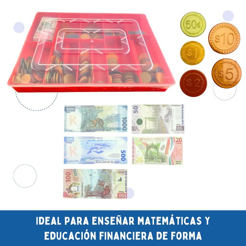 • Características del Producto: Estuche de plástico resistente de 30 cm x 22 cm x 3.5 cm para fácil almacenamiento. Incluye 257 monedas de plástico en denominaciones de 50 centavos, $1, $2, $5 y $10, 150 billetes didácticos: 10 de $1000, 10 de $500, 20 de $200, 30 de $100, 40 de $50 y 40 de $20.
