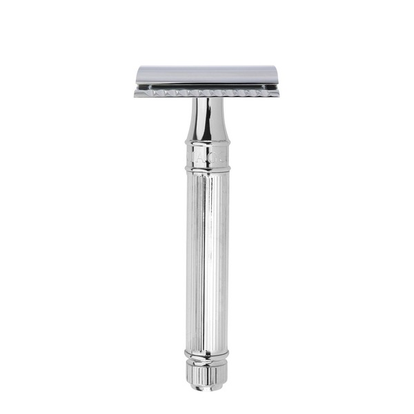 • PREMIUM QUALITY: Machined from solid brass, triple-plated, hand-polished and finished in a chrome lined effect, ensuring improved wet grip and precision control. This classic men’s razor offers a comfortable, barbershop quality shave - every time.