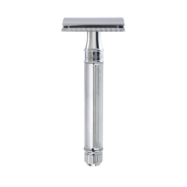 - PREMIUM QUALITY: Machined from solid brass, triple-plated, hand-polished and finished in a chrome lined effect, ensuring improved wet grip and precision control. This classic men’s razor offers a comfortable, barbershop quality shave - every time.
