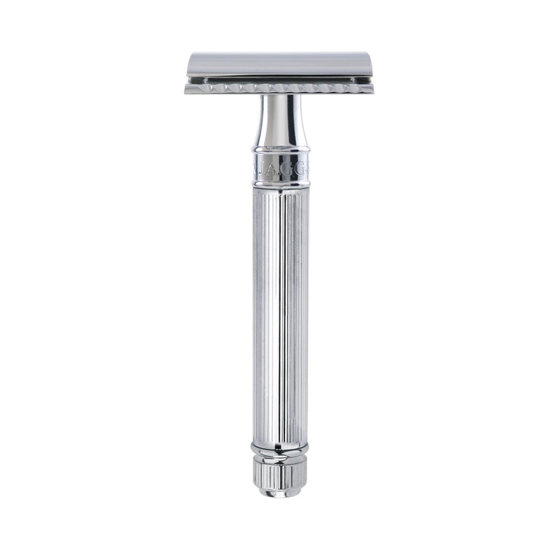 This Double Edge Safety Razor includes 5 Free Derby Double Edge Safety Razor blades to get you started. All original design Edwin Jagger Double Edge Safety Razors come with detailed wet shaving instructions and a product registration card to confirm authenticity. Edwin Jagger is world renowned as the original, English manufacturer of the DE8 range of Double Edge Safety Razor wet shaving razors. This fabulous razor comprises a two part, die cast and hand polished, chrome plated blade head, precision engineered delivers a shaving angle that is gentle on the skin for a smooth, close, comfortable and accurate wet shave; ideal for normal and sensitive skin types. This is the Double Edge Safety Razor is much admired by new and experienced wet shavers worldwide and who enjoy wet shaving results comparable to the original straight cut throat razor. This Edwin Jagger DE Razor is still regarded as an industry leading, classic closed comb head. Triple plated handle and head components finished with a flawless hard blue white chrome plated, scratch resistant coating, compliment the smart hard wearing handle with precise lined patterning and capped with chrome plated end cap detailing. For authenticity, The Edwin Jagger name is embossed into the brass triple plated collar, enhancing the clarity of the name Edwin Jagger and the exquisite quality of this Double Edge Safety Razor. With the industry’s finest Edwin Jagger, traditional double edge safety razor and a quality shaving brush and natural shaving cream you will achieve a very close, smooth and comfortable shave and reduce the chance of in-growing hairs. This Double Edge Safety Razor is shave ready with 5 free blades. Remember to register your genuine razor with Edwin Jagger to benefit from years of world renowned customer support and service.