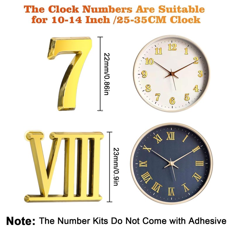 - Number sizes: the Arabic clock hands are 2.2 cm / 0.86 inches high, and the Roman numerals are 2.3 cm / 0.9 inches high. DIY total wall clock size: 10-14 inches/25-35 cm (recommended), you can easily expand or shrink the clock diameter to fit different size walls.