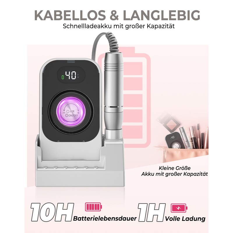 - 【Portable & Atmosphere Light】: cordless nail drill main unit comes with a back clip on the back, which can be hung on the main unit. Whether it is for travel or for salon-level nail care, the back clip design allows you to carry it with you, which is very convenient. Rechargeable nail drill is also equipped with a breathing light, allowing you and your customers to complete professional nail creation in a beautiful lighting atmosphere, bringing a different nail art experience.