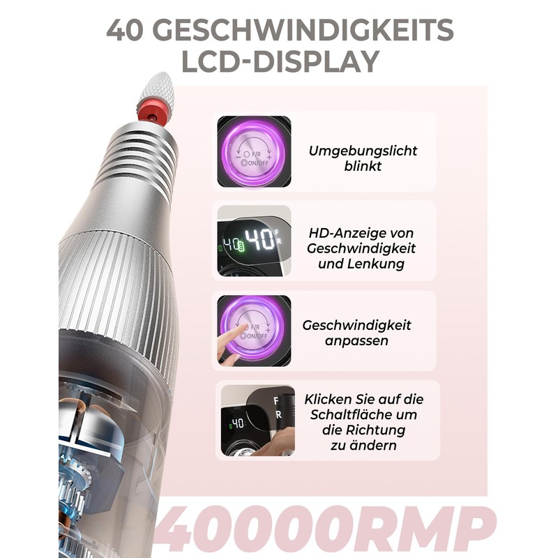 - 【40000RPM Nail File Professional】: Atopskins electric nail file is equipped with 40 adjustable speeds, 40000 RPM high-quality motor to meet all your manicure needs. Simply press or turn the knob cordless nail drill to select 40 different speeds and 2 different directions. Atopskins e file nail drills makes it easy to get salon-level manicures at home, you can maintain beautiful nails precisely and quickly on your schedule without waiting in long lines or rushing to the salon before closing.