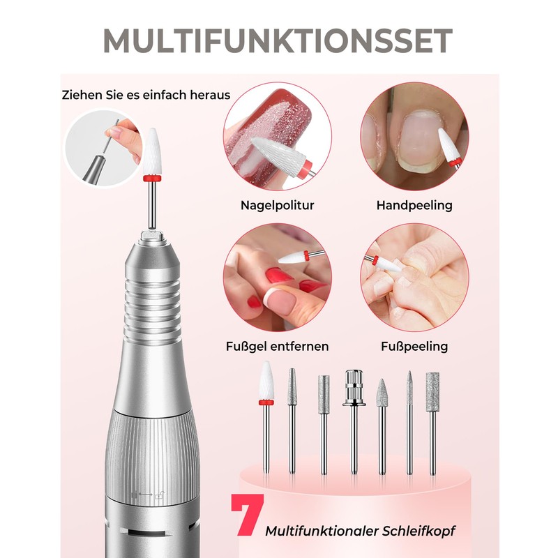 - 【Drill Nails for Salon and Home Use】: Atopskins efile nail drill kit includes 1 nail drill machine, 1 matching base and 6 professional nail drill bits. You can use e file nail drill to easily do manicure at home, Atopskins nail drill can be used to polish nails, trim nail shapes, remove nail polish and polish nail surfaces, and remove cuticles from hands and feet. In addition, you can also use it for other artistic creations, such as carving and crafts.