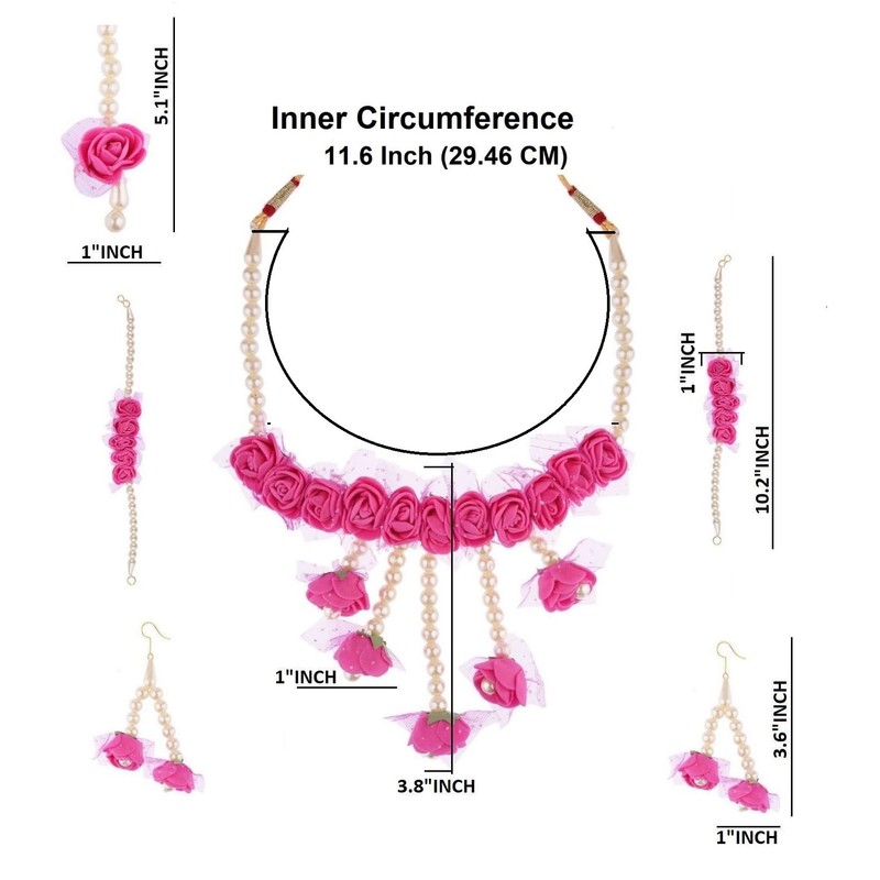 - Make a style with appealing haldi floral designer collar necklace jewellery set, Content: 1) Choker Necklace Inner Circumference: 11.6 Inch (29.46 cm ) with adjustable closure, 2) A pair of Dangle Earrings L x W: 3.6"Inch x 1"Inch (9.14 cm x 2.54 cm), 3) Maang tika: L X W: 5.1"Inch x 1"Inch (12.95 cm x 2.54 cm), 4) A pair of hand bracelet L x W: 10.2"Inch x 1"Inch (25.90 cm x 2.54 cm).Metal: Alloy.
