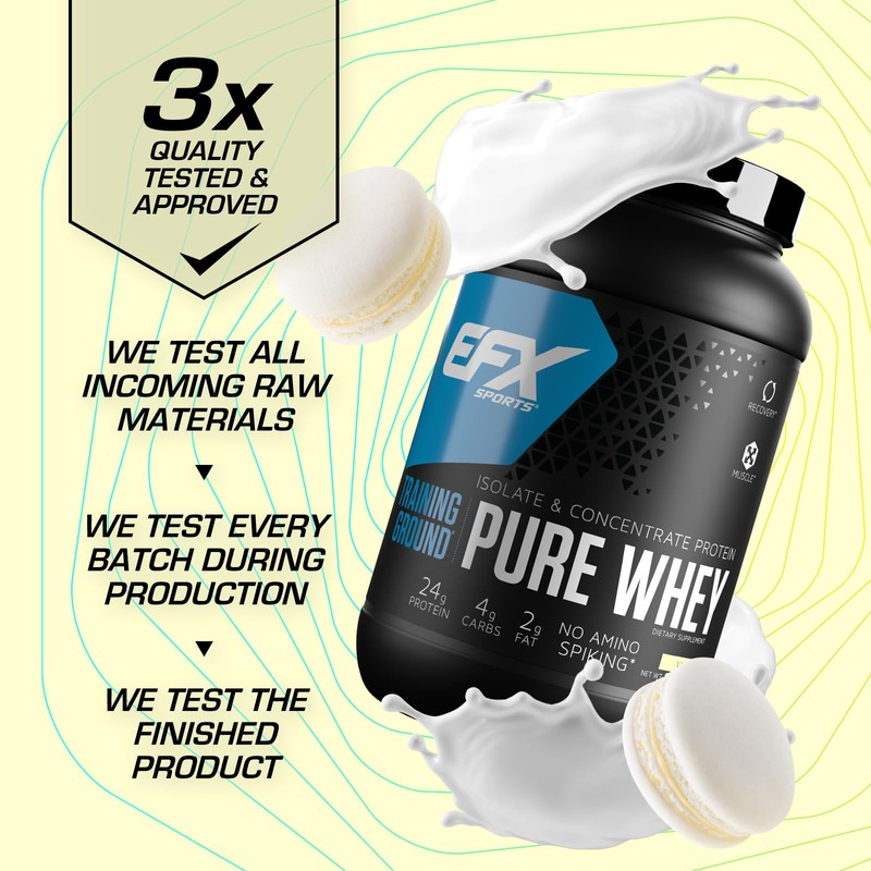 - MANUFACTURED IN-HOUSE: EFX Sports is part of a very small, elite group of brands who actually make their own products. That’s why we guarantee Training Ground Pure Whey always meets label claims and is 100% banned-substance free. With any EFX Sports product, you'll know that you're getting a pure, potent, and safe product.