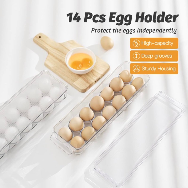 Fridge organizers and storage is made of food-grade safe transparent PET material; Good visibility; Low temperature resistant; Suitable to be kept in the refrigerator Groove design can ensure each egg is placed separately, preventing shaking or crushing. The food-grade highly transparent PET material enables you to view the remaining quantity of eggs. Stackable storage saves space in the refrigerator and keeps neat. 14 eggs can be placed separately in the box; the Handle design makes it easy to hold and place the box. Refrigerators, freezers, pantry, kitchen cabinets, camping and picnics. The egg storage box measures about 14.5 * 4.3 * 3 inches (about 37 * 11 * 8 cm), 2 Pack x 14 Egg, come with carton box. Note: Manual measurement may exist a difference of 0-0.2 inches, please refer to the actual product received.