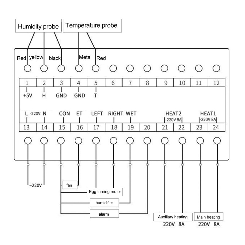 Number Of Output Channels: 7 Channels (over Temperature, Temperature Control, Under Temperature, Turning Eggs, Turning Right, Humidity Control, Alarm)