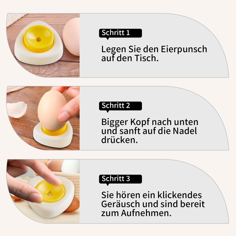 - 【Easy to use】Using these egg piercers is very simple: put the punch needle on the table, then put the egg hole cutter on the table and poke inside. With a sharp needle, you can easily drill small holes in the hard-boiled egg, so we can easily peel off the shell.