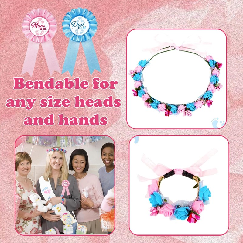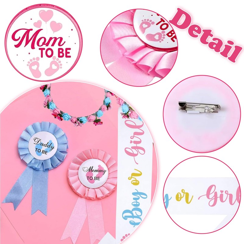 - Complete Baby Shower Set: This all-in-one kit includes 1 "Boy or Girl" sash, 1 "Mommy to Be" pin, 1 "Daddy to Be" pin, and 2 stunning flower crowns, making it a perfect choice to celebrate the arrival of your baby in style.