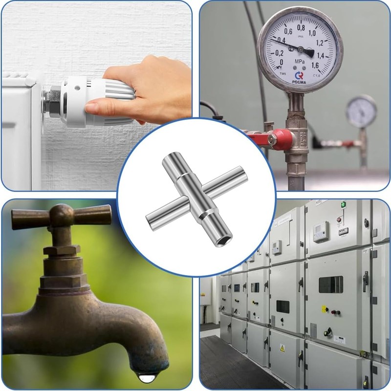 • Square wrench. Widely used: suitable for water valves, taps and most valves. and the gas chimney wrench seamlessly adapts to various ball valves, controlling the water pluck on outdoor sillcocks, radiators, adjusting electrical systems, managing gas fire pits to assisting in maintenance work in trains, cabinets, elevators and fireplaces.