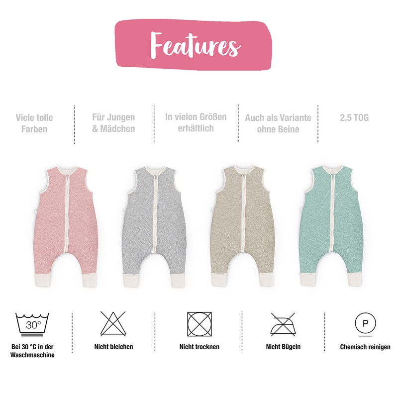 - Can be used all year round and various designs – can be used as a year-round sleeping bag or sleeping bag winter. Available as a sleeping bag with feet and round baby sleeping bag in great designs.
