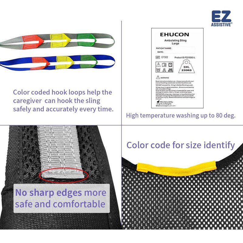 - 【All-Round Security Principles】The hoyer lifts for home use sling has three color loops, allowing caregivers to quickly and accurately identify and hang the loops on the hoist to ensure that the user remains balanced and safe. The waist belt is equipped with both Velcro and sturdy buckles, providing dual security to effectively prevent the user from leaning or falling during walking training. This dual protection design ensures a safe working load and minimizes the risk of falling.