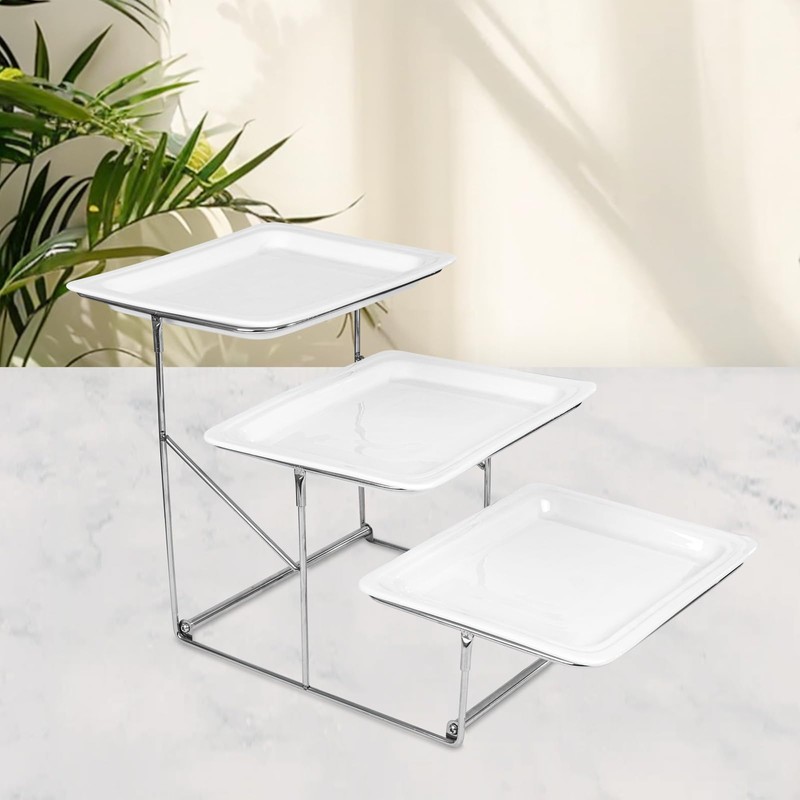 - EI 3-Tier Rectangle Plate Set with Metal Stand,White for Party,serving tray,12.5inch Crack-Proof Platters for Serving Food,White Reusable Trays,Stand for brunch decorations,Dessert Fruit