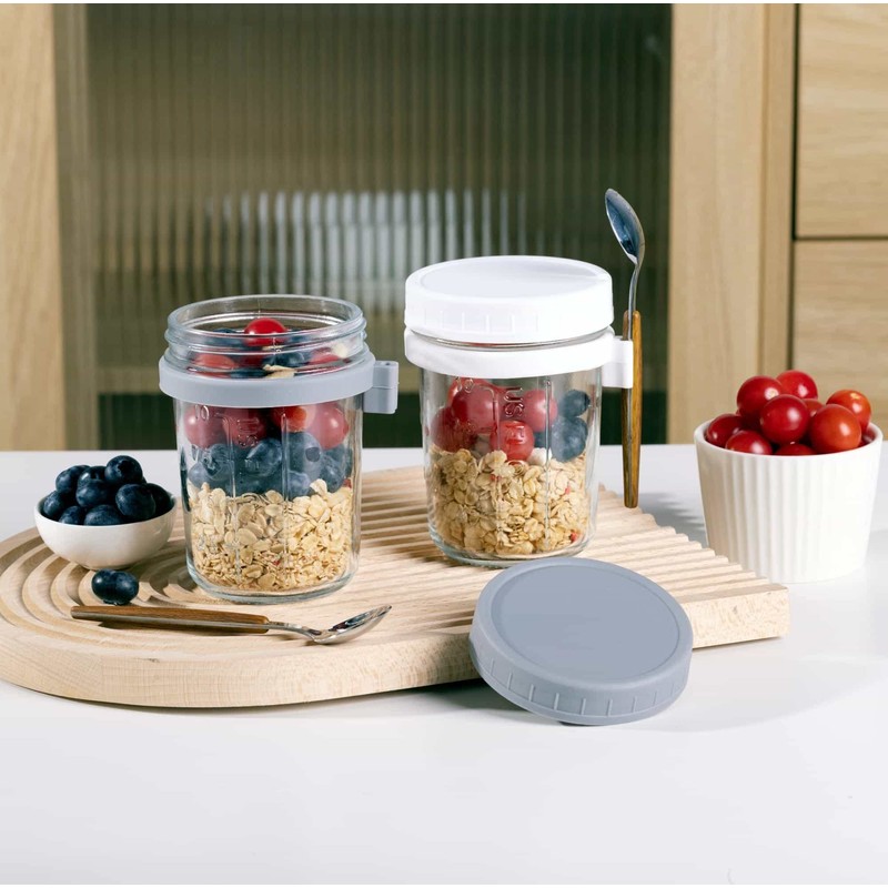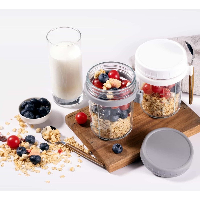 Eidoct Overnight Oats Container 2-Pack, Overnight Oats Jars with Lid and Spoon 10 oz Cereals, Milk, Fruit Salad, with Measurement Mark (grey and white)