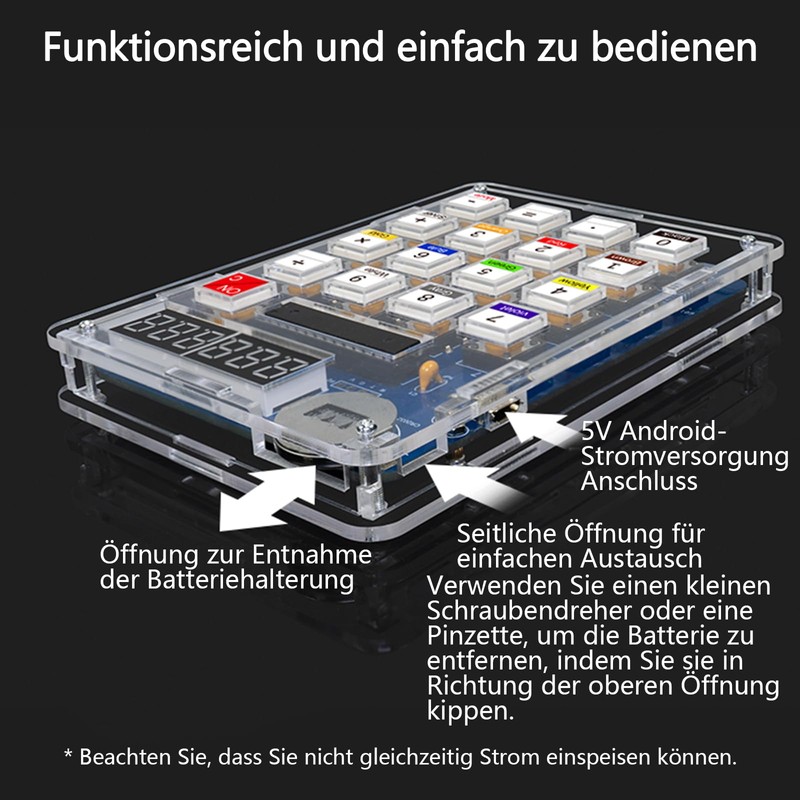- Elegant transparent case design: the soldering kit has a slim, transparent case design that gives your DIY creations a modern touch. The transparent design allows you to take a look at the inner workings of the calculator, which increases the learning value of the soldering process. In addition, this kit offers both a USB and battery power supply, giving you the flexibility to choose the most suitable charging method.