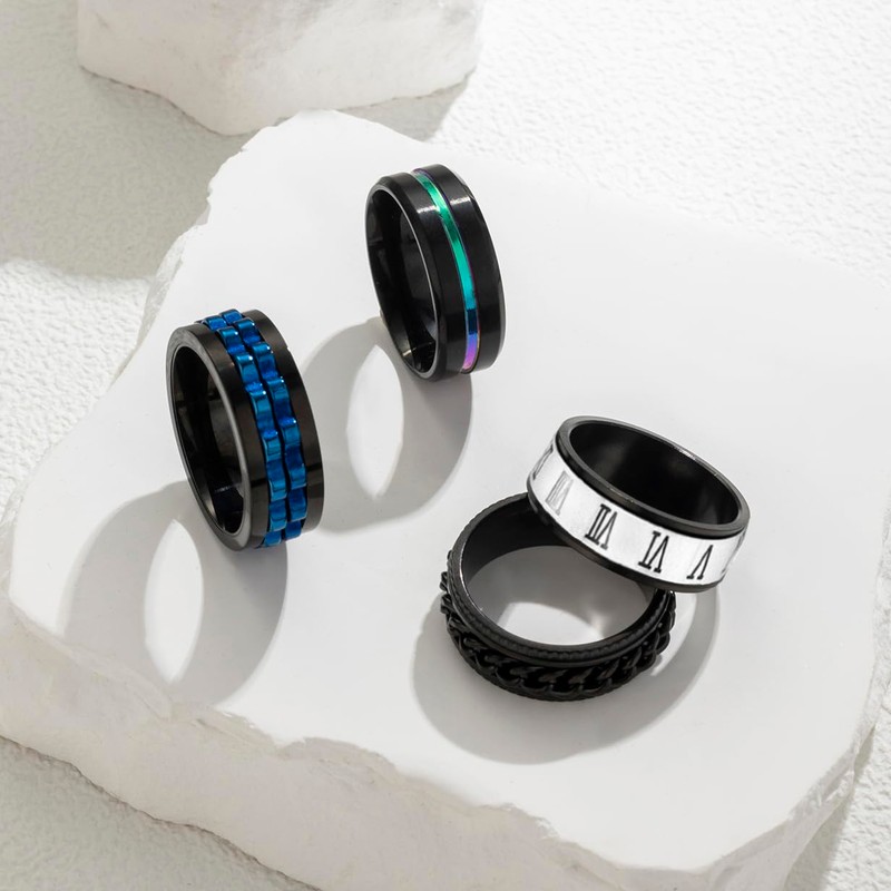 - COOL RINGS: One set has 4pcs spinner rings, including 1pcs Greek Key pattern fidget ring,1pcs gear spinner ring and 2pcs curb chain inlaid design spinning rings. You can spin these chain/band/gear to relieve anxiety and boringness. Ideal fidget rings design suit perfect for a stress & anxiety relief tool