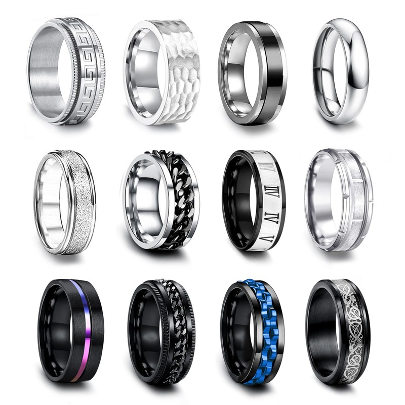 - MENS RINGS SET:One order come with 12pcs stainless steel band rings in various styles, 1pcs pattern beveled edges ring, 2pcs chain spinner rings, 1pcs gear spinner ring, 4pcs cool silver band rings, 1pcs Greek Key Pattern fidget ring, 1pcs Roman numerals Ring, the other 2pcs inlaid colored and black band. You can wear whichever ring you are in the mood for that day. 7/8/9/10/11/12/13/14 ring sizes available, suit most men and women