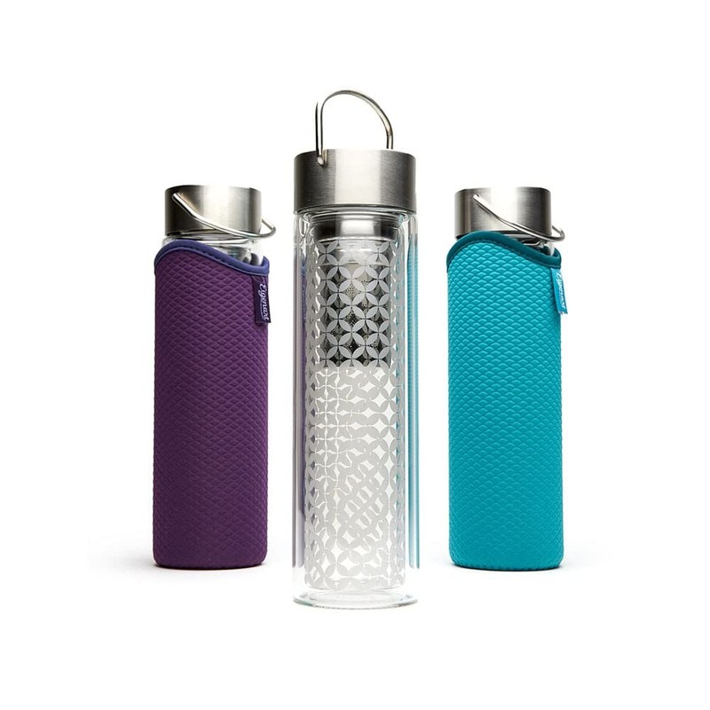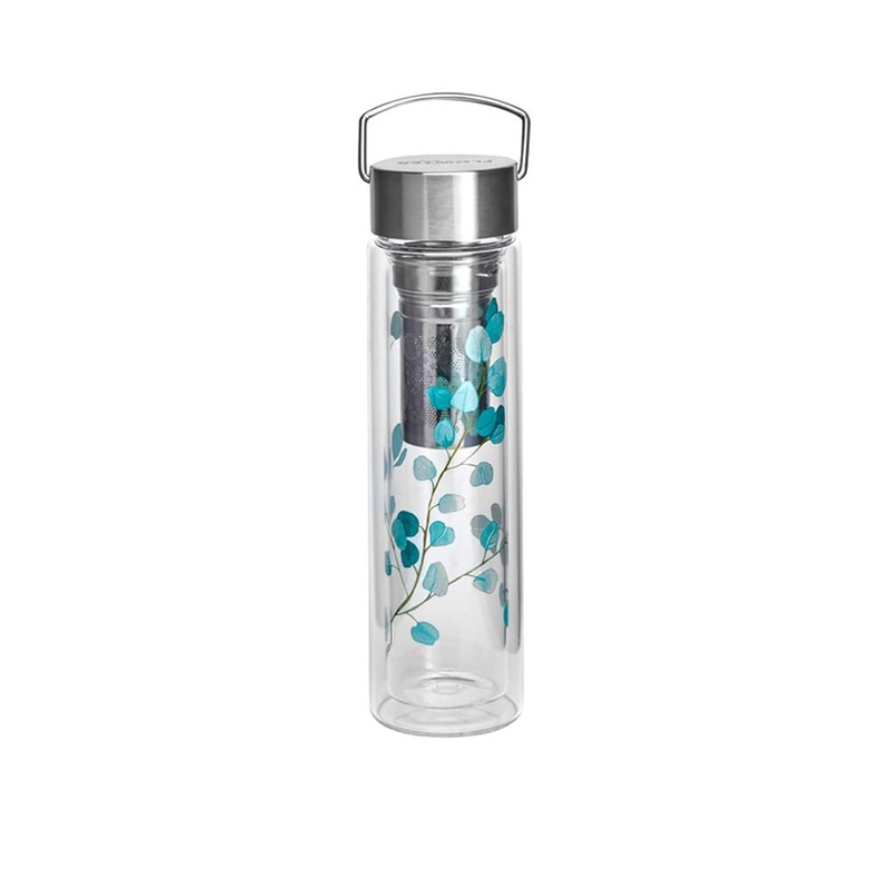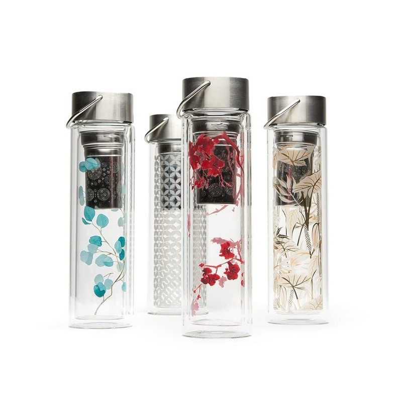 - Double-walled tea maker made of glass including stainless steel lid with carry handle and thermal jacket