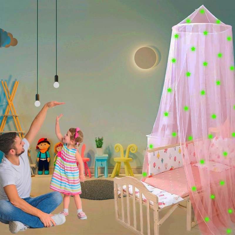 - ❖ Bed Canopy Glow in the Dark - These stars are made of eco-friendly materials and use advanced thermal printing technology to adhere on the mosquito net, that stars will not fall. and feel of the fabric is very softt that can be safely as a crib canopy, the rope can be used to adjust the suitable hanging height.