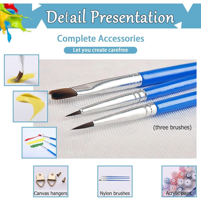 - 【paint by numbers kit】:Contains 3*paint brushes, 2*hook up, 1*canvas for painting。1*set of acrylic paint, 1*use instructions, size is 16x20inch (No frame).