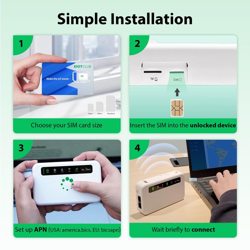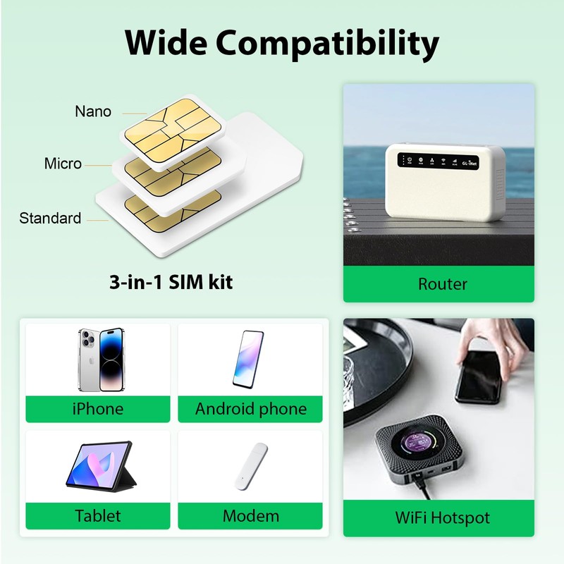 - Device Compatibility - Pre-cut SIM cards are compatible with iPhone, Android phone, tablet, 5G/4G router, WiFi hotspot, 4G modem, and more unlocked decives. APN: "america.bics" / "bicsapn"