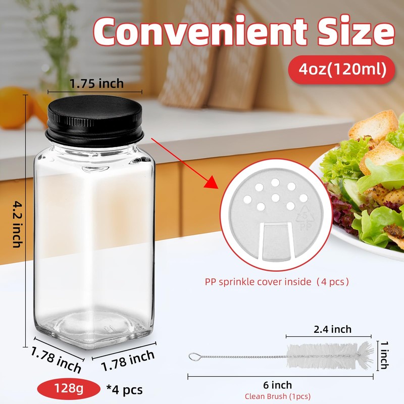 - Compact Yet Capacious: Our 2-piece spice jar set is designed with your space in mind. Each jar holds 4 fl.oz and measuresapproximately 1.7" x 1.7" x 4.1" , providing ample storage without taking up too much room. Compact, convenient, and classy—these jars fit seamlessly in any kitchen.