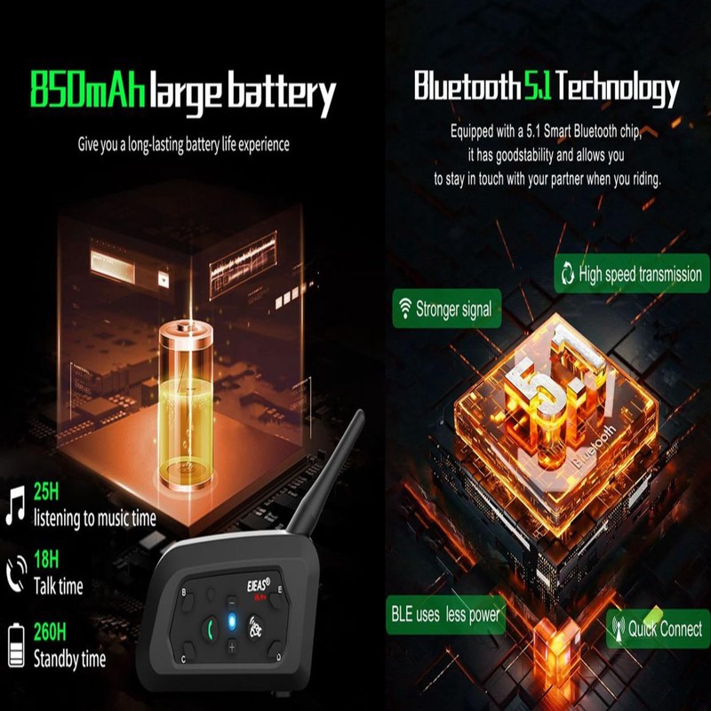 - 【Large Battery Capacity of Bluetooth Motorcycle Helmet】 The EJEAS V6 Pro intercom runs on 850mAh large rechargeable battery, just charge for 3.5 hours, the intercom working time can reach 12hours and the standby time can reach 360hours