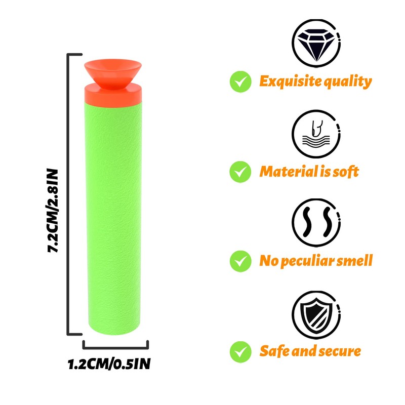 - Comparado con otros dardos de succión, el diseño mejorado de la punta de succión tiene un alcance más largo sin afectar la potencia de succión. (Consejo: Hay polvo protector en la cabeza de la ventosa que evita que envejezca y se endurezca durante el transporte y almacenamiento. Por favor, lávelo con agua limpia antes del primer uso.)