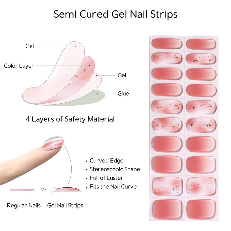 - PERFECT FIT - Cure 60% early, our nail gel strips are made with real liquid gel and fit all types of nail sizes and shapes. Whether your nails are round or square, jelly-like gel nail wraps will look great.
