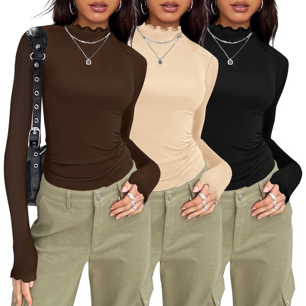 Ekouaer Long Sleeve Shirts for Women 3 Pack Mock Neck Thermal Tops Basic Undershirt Casual Basic Tee Black/Brown/Yellow XL
