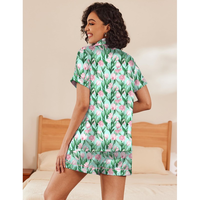 Ekouaer Pajamas for Women Set Silky Satin Pjs Short Sleeve Nightwear Notch Collar 2 Piece Sleepwear & Loungewear,Tulip,XL