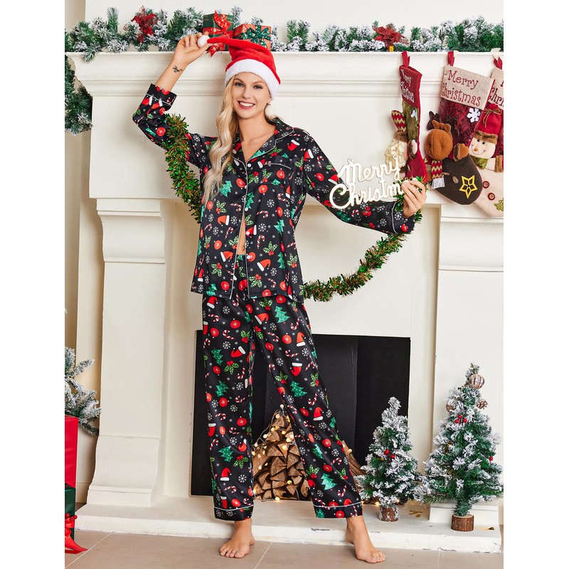 Ekouaer Women's Classic Button Down Long Satin Silk Pajama Set,Medium,Black Chirstmas Pattern